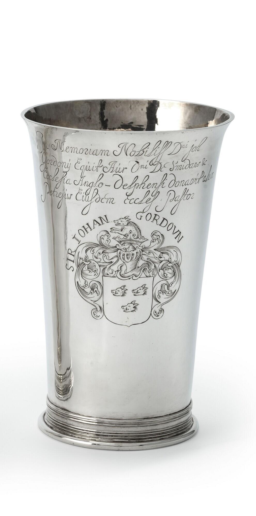 avondmaalsbeker met inscriptie: 'Sir Johan Gordoun' en een wapen met 3 everzwijnkoppen