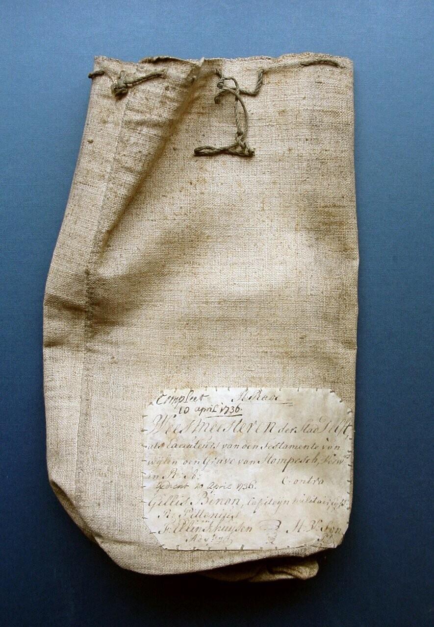 Zak, afkomstig uit de Weeskamer (stadhuis Delft), waarin officiële stukken (rechtstukken e.d.) in bewaard werden. Op de zak is een etiket genaaid waarop staat wat in de zak zit. (in dit geval stukken in een zaak van de Weesmeesteren der Stad Delft...