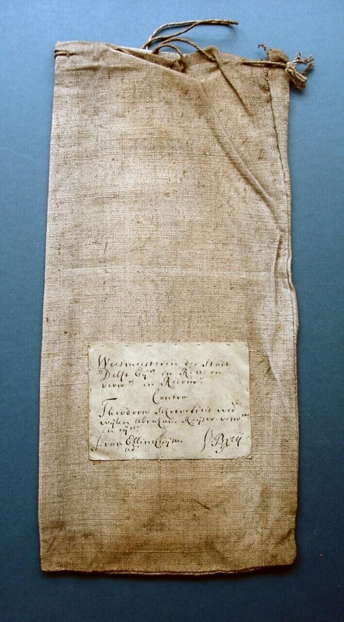 Zak, afkomstig uit de Weeskamer (stadhuis Delft), waarin officiële stukken (rechtstukken e.d.) in bewaard werden. Op de zak is een etiket genaaid waarop staat wat in de zak zit. (in dit geval stukken in een zaak van de Weesmeesteren der Stad Delft...