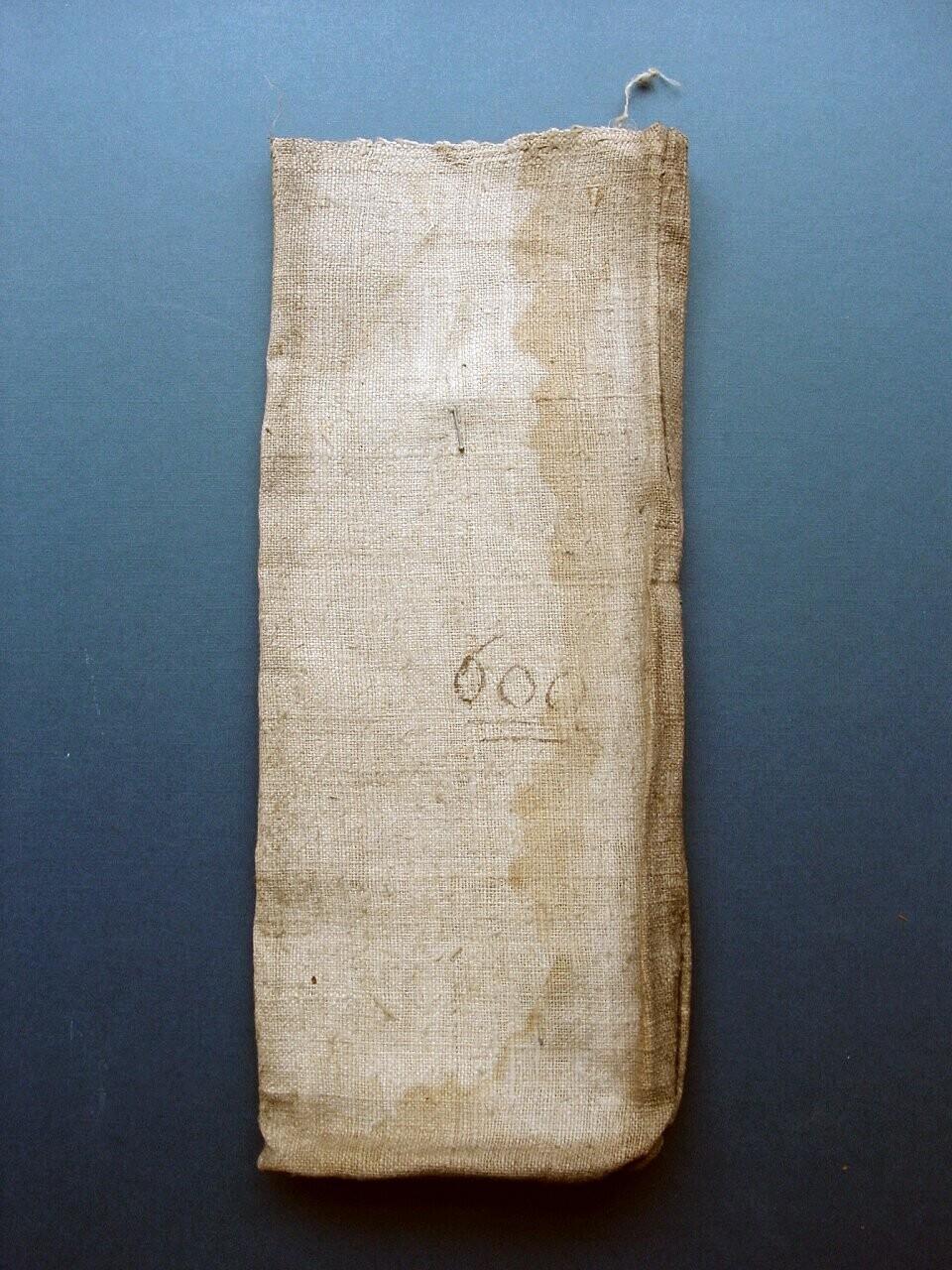 Zak, afkomstig uit de Weeskamer (stadhuis Delft), waarin officiële stukken (rechtstukken e.d.) in bewaard werden. Op de zak is het getal 600 geschreven en er is een naald in de zak gestoken. Op de zak, aan de achterkant, zijn lakresten te zien.
