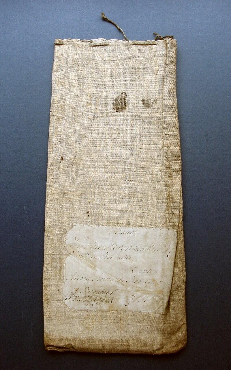 Zak, afkomstig uit de Weeskamer (stadhuis Delft), waarin officiële stukken (rechtstukken e.d.) in bewaard werden. Op de zak is een etiket genaaid waarop staat wat in de zak zit, (in dit geval stukken in een zaak van de Weesmeesteren der Stad Delft...