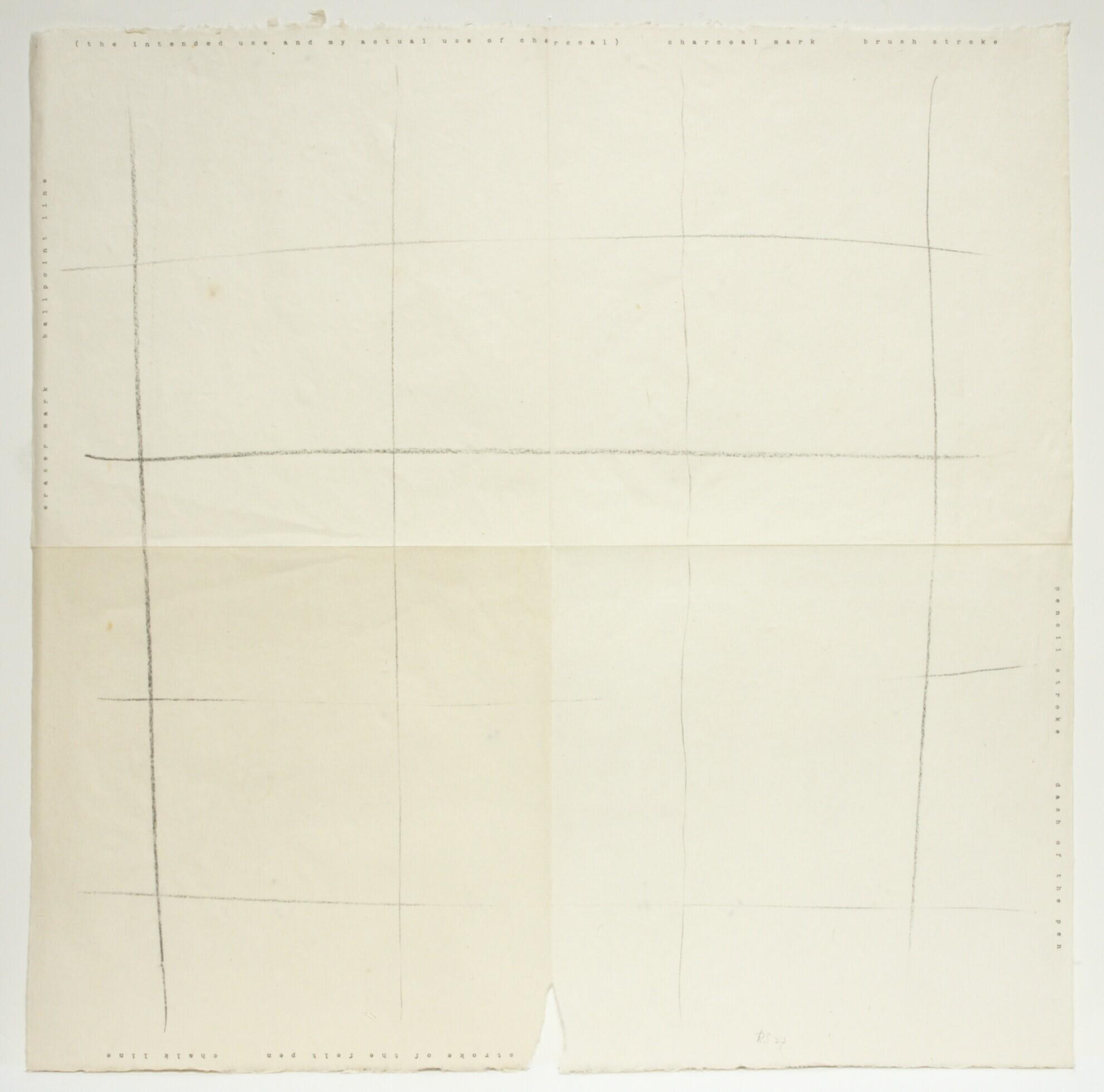 Beschrijving van het (kunst)werk: Vierkant vel wit papier met onregelmatige rand, rondom langs de rand betypt (met o.a. titel van het werk). Over het blad lopen horizontale en verticale lijnen.