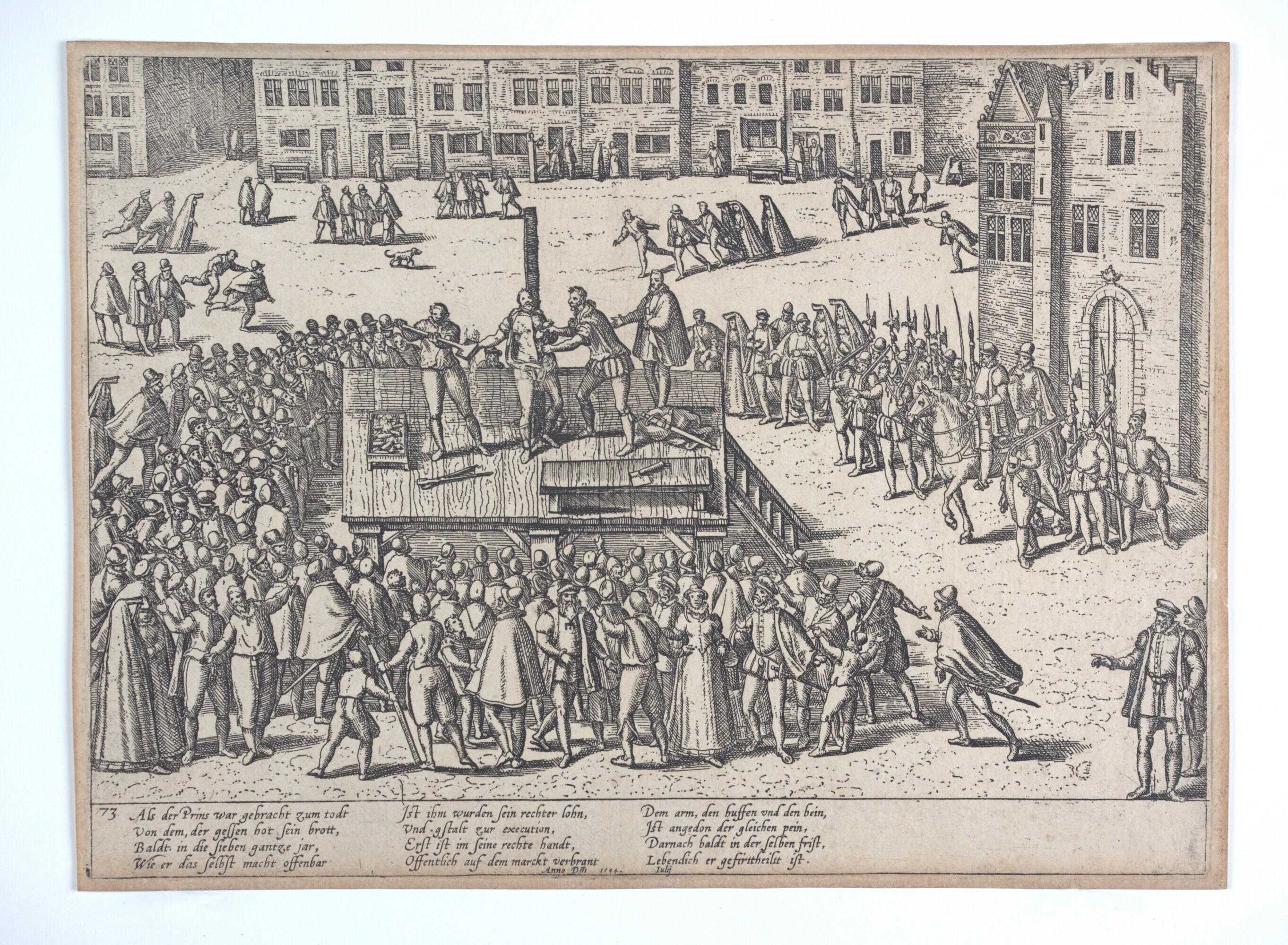 De terechtstelling van Balthasar Gerards op de Markt van Delft. Zijn rechterhand, waarmee het hij fatale schot heeft gelost, wordt met een gloeiend wafelijzer afgebrand. Balthasar wordt na nog meer folteringen ontmand en opengesneden. Zijn hart wo...