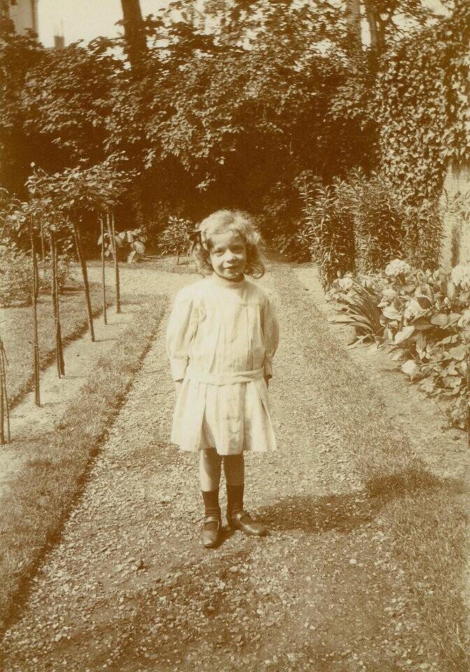 Annita Seeger (14-3-1907) staande op een pad in een tuin.