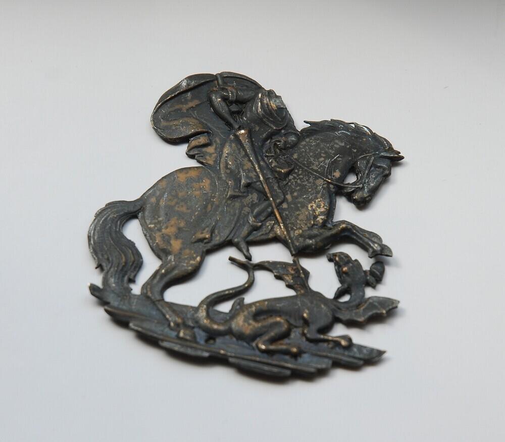 Embleem, plat, opengewerkt, in de vorm van Sint Joris te paard met lans en de draak.