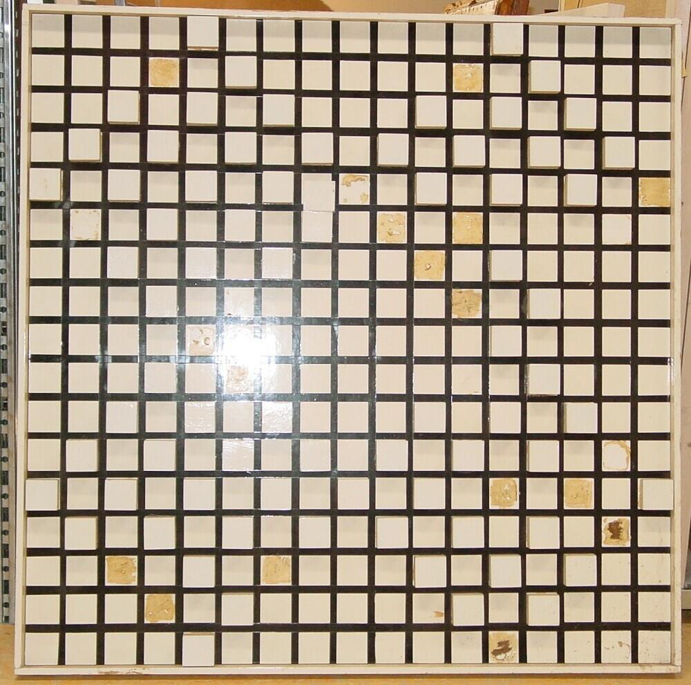Beschrijving van het (kunst)werk: Wandobject bestaande uit een raster van witte vierkanten en blokken.