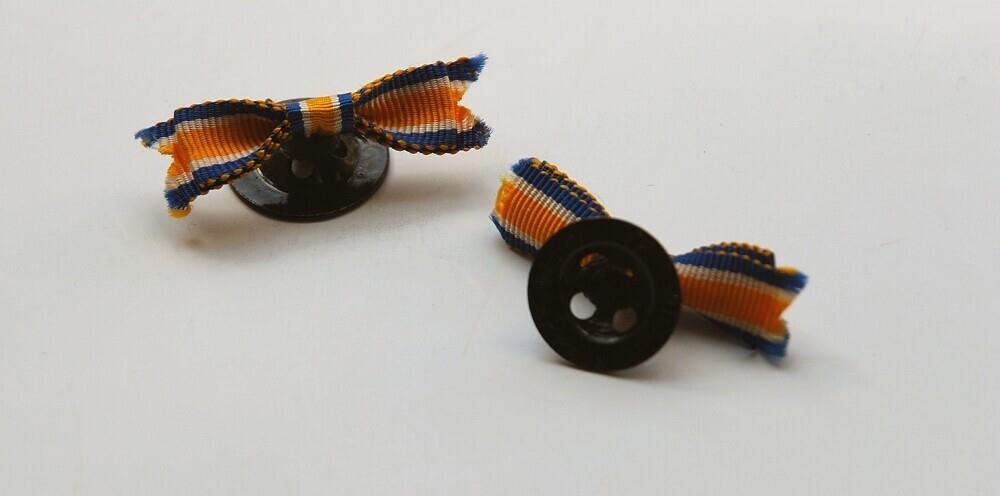 Knoop, zwart, met strikvormig lintje, blauw/wit/oranje. Lintje is met zwart garen aan knoop bevestigd.
