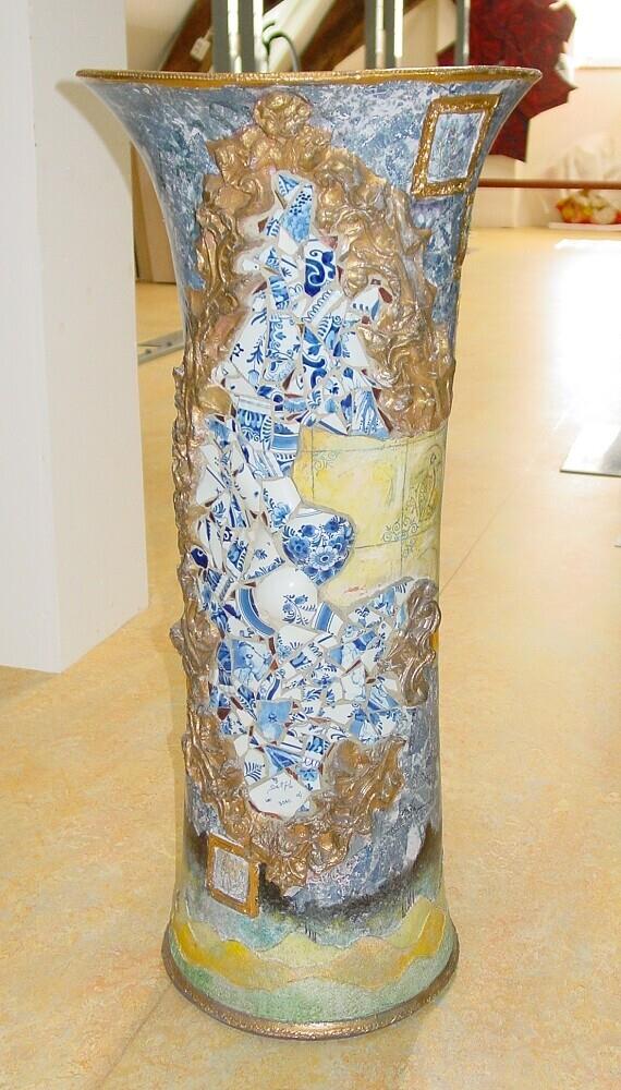 Beschrijving van het (kunst)werk: Vaas bekleedt met 'Delfts blauwe' tegelscherven welke door een goudkleurige rand omgeven zijn. Op de open stukken zijn afbeeldingen van tegels getekend.