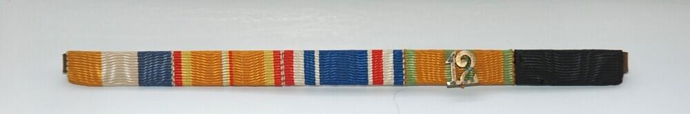 Langwerpige baton, militair onderscheidingsteken, bespannen met textiel bestaande uit balken in verschillende kleuren , opgesierd met het getal 12 (wat mogelijk een insigne voor het lopen van de Nijmeegse Vierdaagse is, in dit geval 12 keer).