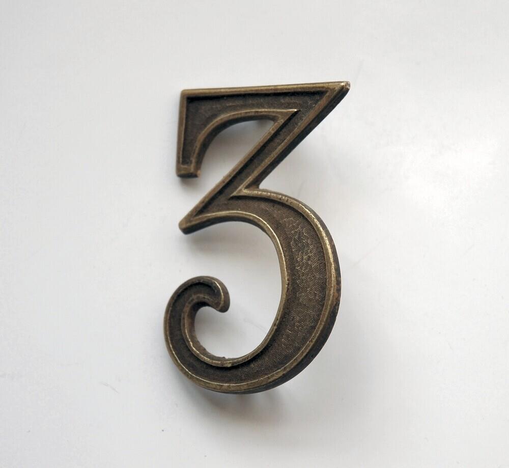 (kast?)nummer in de vorm van een drie, koperkleurig, met 2 uitstekende oogjes aan achterkant voor het bevestigen.