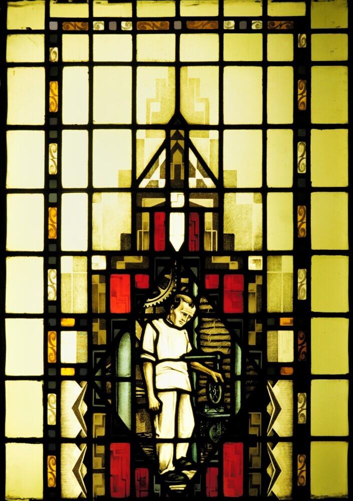 - Glas-in-loodraam 'Arbeider met hand op wiel'