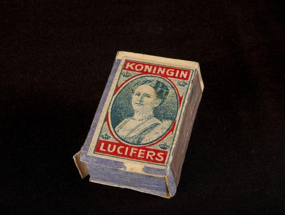 Luciferdoosje met de afbeelding van Wilhelmina. Boven de afbeelding: Koningin. Onder de afbeelding Lucifers. In het doosje rode lucifers met een witte kop.