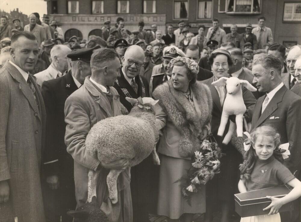 De Koningin heeft ook een speelgoedlam aangeboden gekregen voor prinses Marijke door de achtjarige Alice van der Kwaak, dochter van de wethouder. (bron Nieuwe Leidsche Courant, 21 mei 1954)