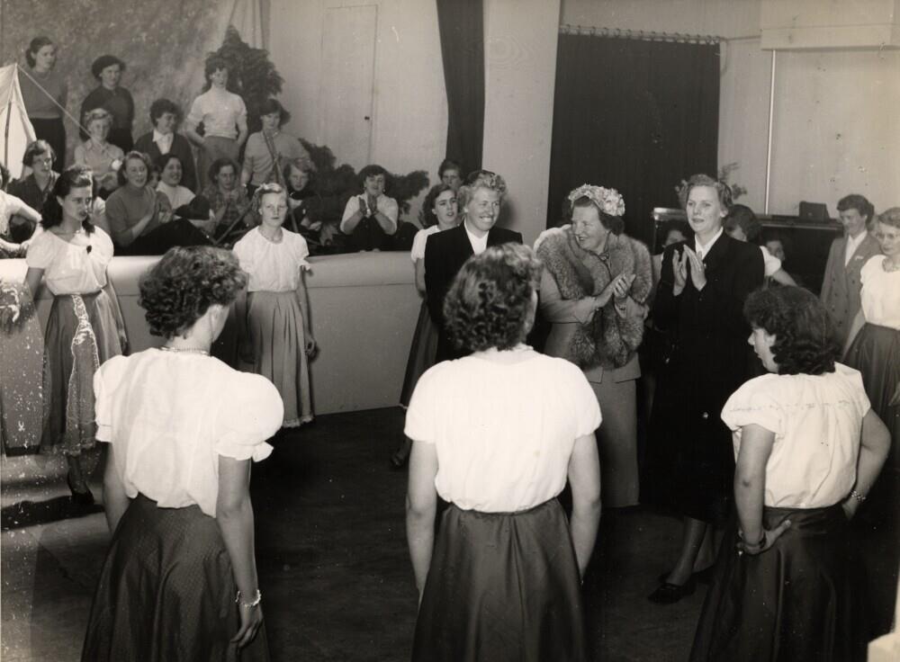 Vermoedelijk beelden van het bezoek aan de textielfabriek Johan Parmentier waar H.M. werd voorgelicht over de doelstellingen en werkzaamheden van de stichting De Sleutelbloem en de Mater Amabilisschool. (bron Nieuwe Leidsche Courant, 21 mei 1954)<...