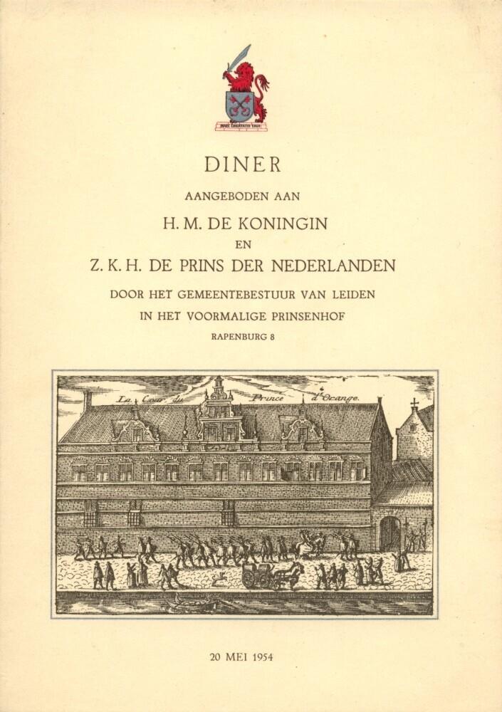 Voorblad van de menukaart van het diner aangeboden aan H.M. de Koningin en Z.K.H. de Prins der Nederlanden door het Gemeentebestuur van Leiden in het voormalige Prinsenhof, Rapenburg 8, 20 mei 1954