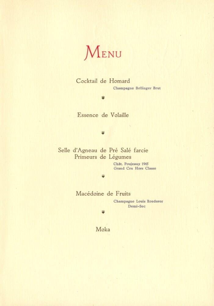 Binnenblad van de menukaart van het diner aangeboden aan H.M. de Koningin en Z.K.H. de Prins der Nederlanden door het Gemeentebestuur van Leiden in het voormalige Prinsenhof, Rapenburg 8, 20 mei 1954