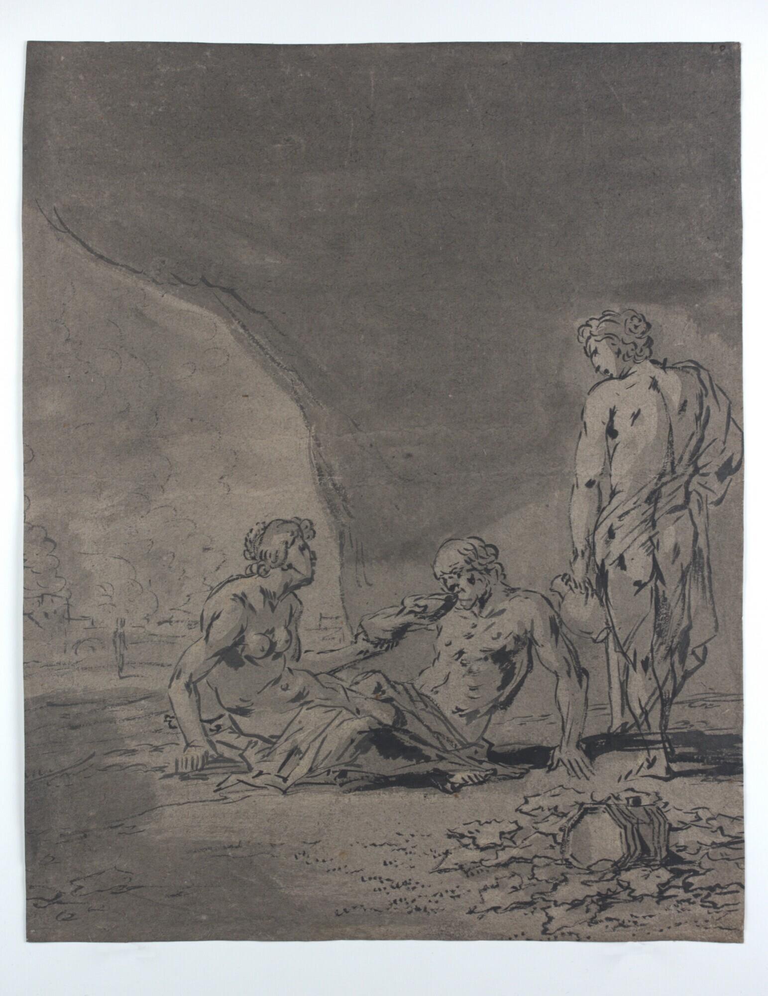 - donkergrijs lompenpapier, zonder watermerk met vergé, penseel in zwart en grijs in combinatie met grijze wassingen en bruine dekverf
