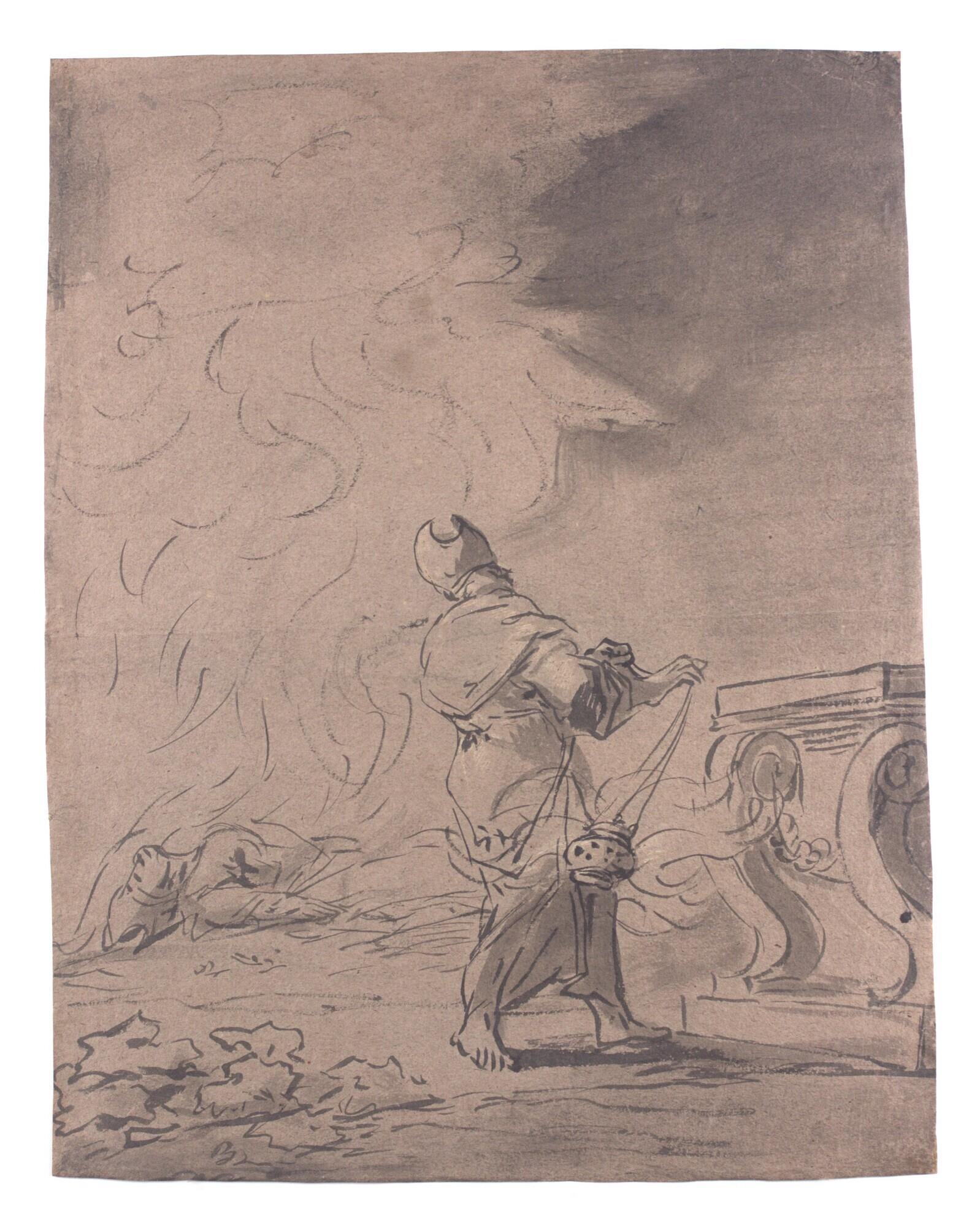 - donkergrijs lompenpapier, zonder watermerk met vergé, penseel in zwart en grijs in combinatie met grijze wassingen en bruine dekverf