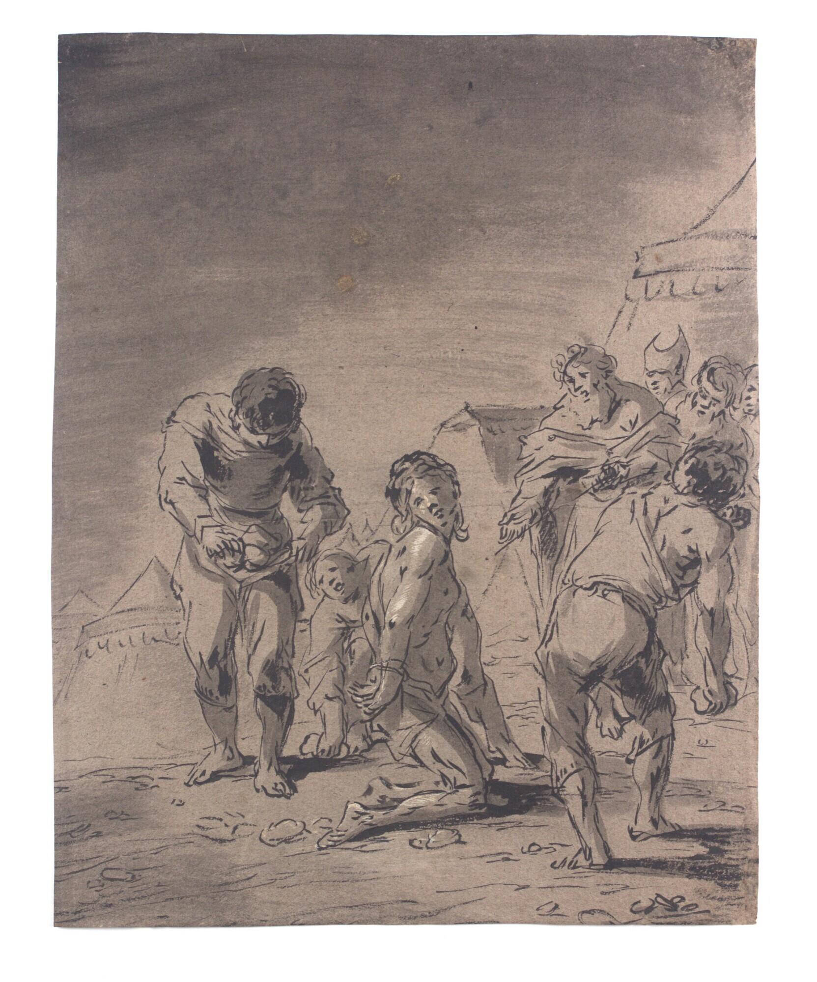 - donkergrijs lompenpapier, zonder watermerk met vergé, penseel in zwart en grijs in combinatie met grijze wassingen en bruine dekverf