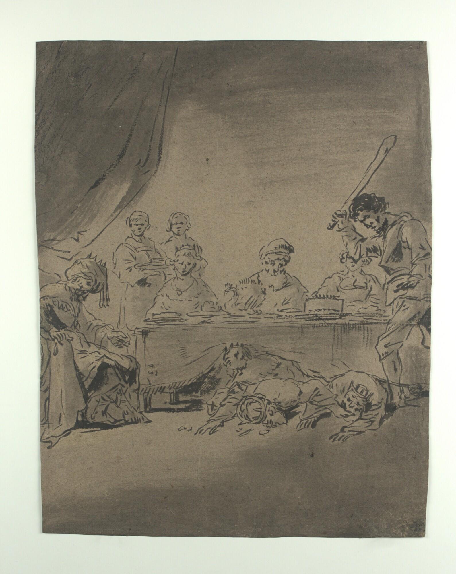 - donkergrijs lompenpapier, zonder watermerk met vergé, penseel in zwart en grijs in combinatie met grijze wassingen en bruine dekverf