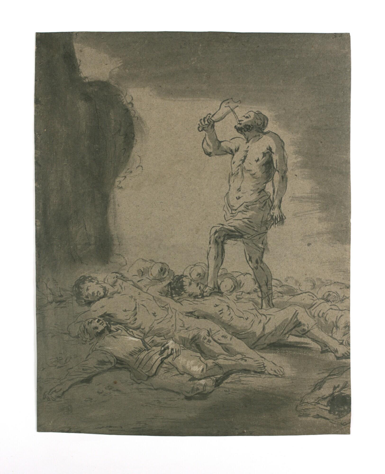 - donkergrijs lompenpapier, zonder watermerk met vergé, penseel in zwart en grijs in combinatie met grijze wassingen en bruine dekverf