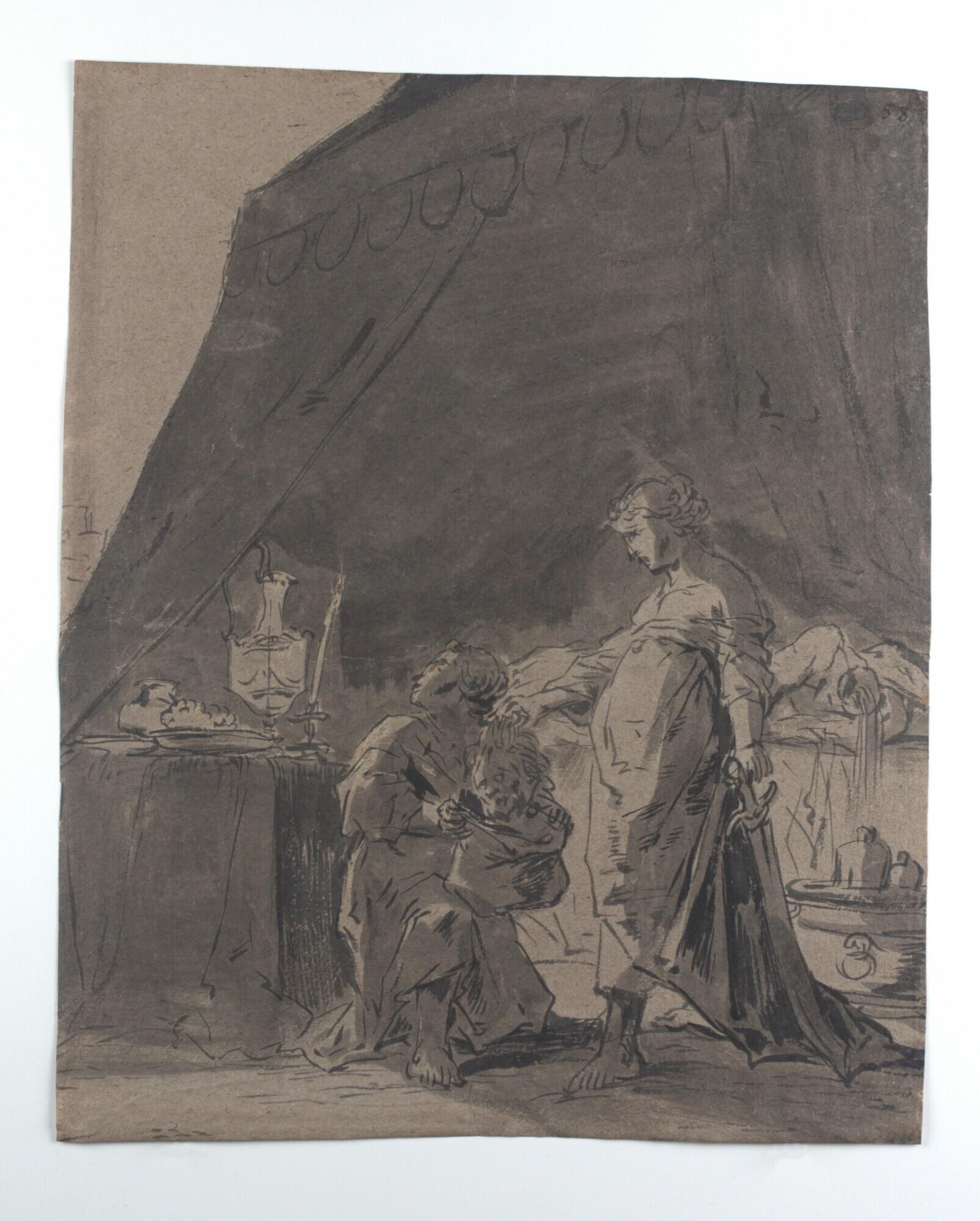 - donkergrijs lompenpapier, zonder watermerk met vergé, penseel in zwart en grijs in combinatie met grijze wassingen en bruine dekverf