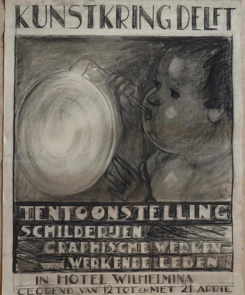 - affiche van de Kunstkring Delft, voor de tentoonstelling 'schilderijen graphisch werk enz. van werkende leden' gehouden in hotel Wilhelmina, Delft