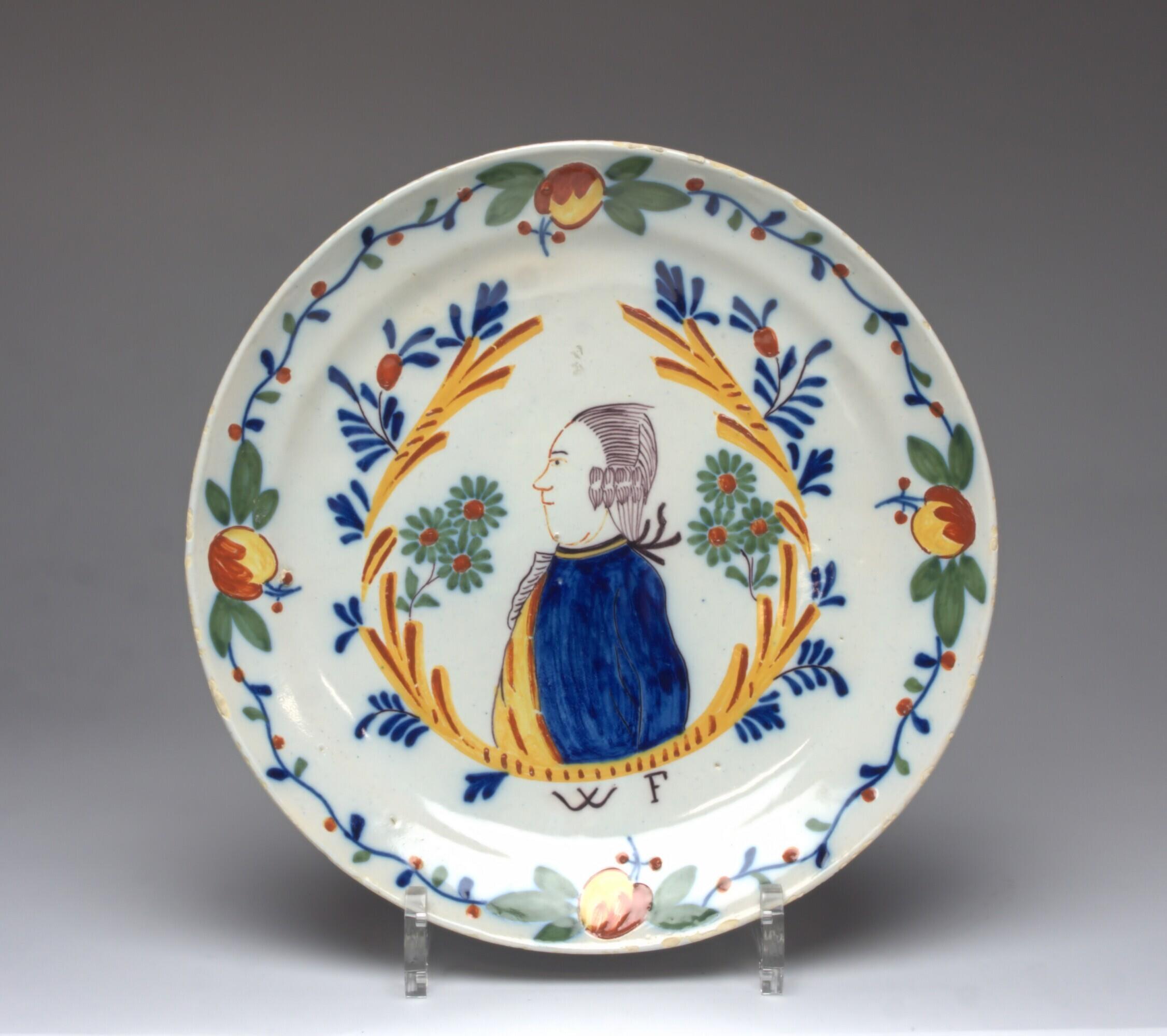 Bord zonder standring met op het plat een halfportret, en profil naar links, van Willem I met pruik en gehuld in blauw uniform met oranje sjerp en witte bef. Het portret is omlijst met een oranje krans met bloemranken. Op de rand een zoom van slin...
