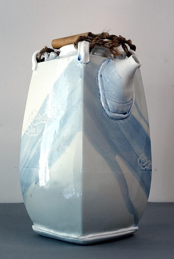 Hoge theepot, met deksel, op basis van een vierkante voet, licht taps naar boven toelopend met behoud van de ribben. Op de bovenhoeken vier lussen waardoor touw met bamboe handvat. Waterige kobaltblauwe decoratie in vegen met de hand aangebracht. ...