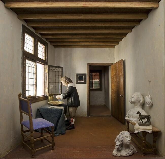 Vermeerkijk- of perspectiefkast naar een in een veilingcatalogus (Amsterdam 1696) vermeld en waarschijnlijk verloren gegaan schilderij van Johannes Vermeer 'Daer een Seigneur zyn handen wast, in een doorsiende kamer, met beelden'.