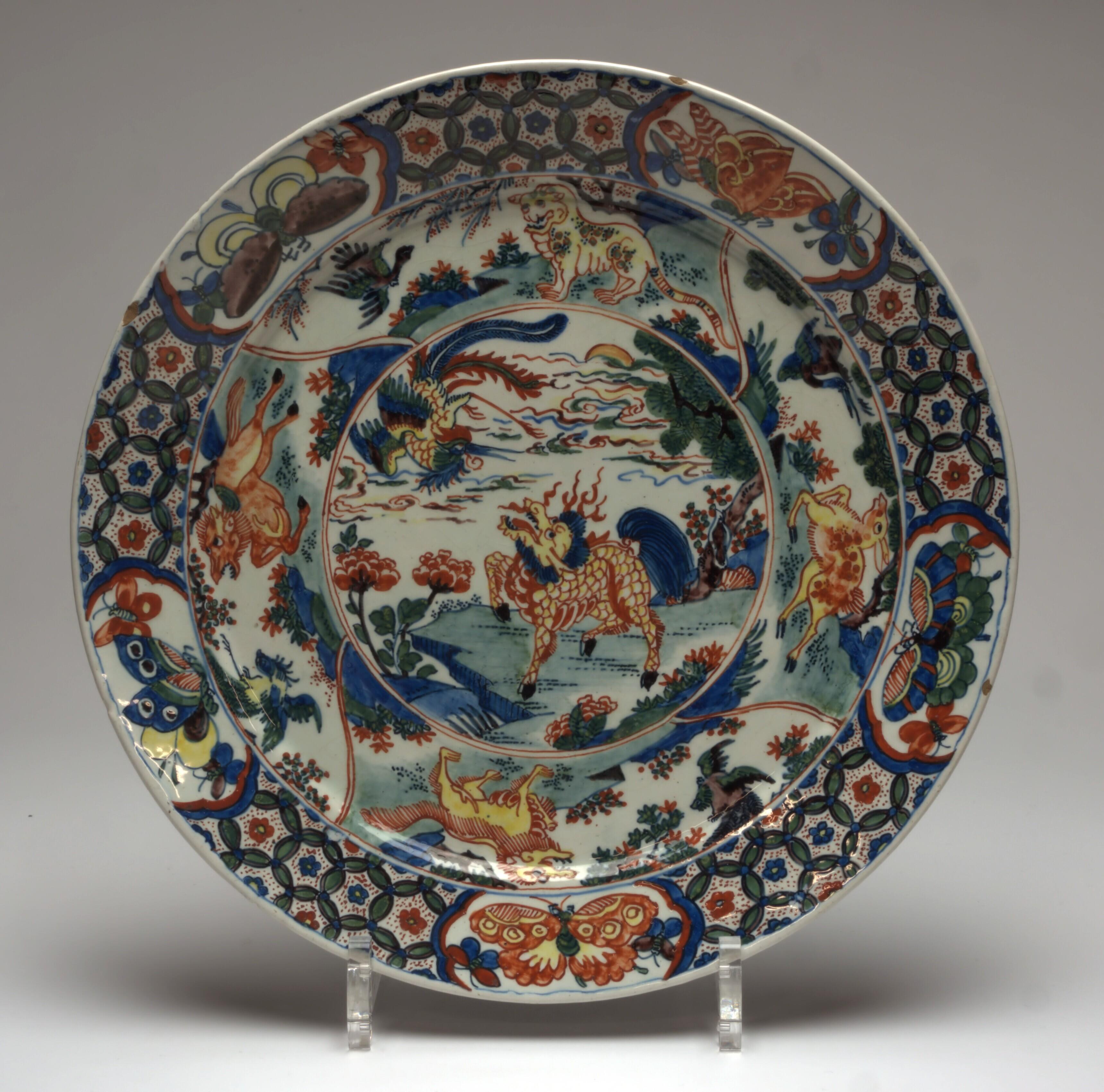 Het zonder standring uitgevoerde bord loopt aan de achterkant iets bol naar een vlak middendeel. Aan de voorkant is in het plat een medaillon afgebeeld met Chinese mythologische dieren (Kylin en Fong-Hoang in een landschap. Hieromheen is een band ...