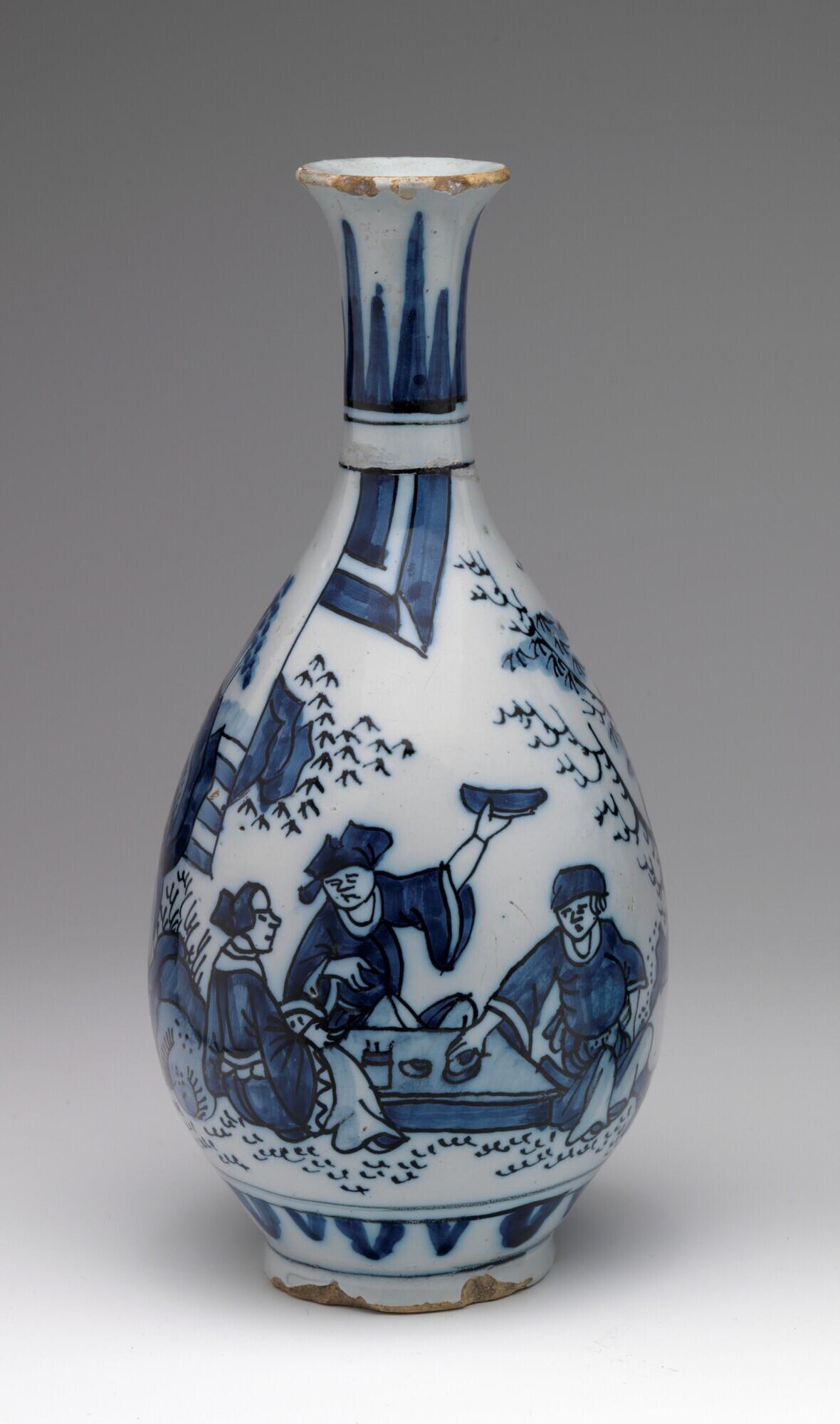 Peervormige vaas met trompetvormige hals, met een afbeelding van een rotslandschap met drie, aan een lage tafel zittende figuren, waarvan één een object omhoog houdt en een ander iets van de tafel pakt. Een vierde figuur staat met boek onder de ar...