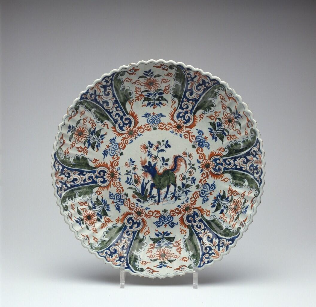 De met standring uitgevoerde, verdiepte schotel heeft een gribde rand. De voorstelling is over het hele oppervlak aangebracht. In het centrum is een fabeldier tussen bloemen geschilderd. Deze scène is omgeven door een band van ranken. De wanden zi...