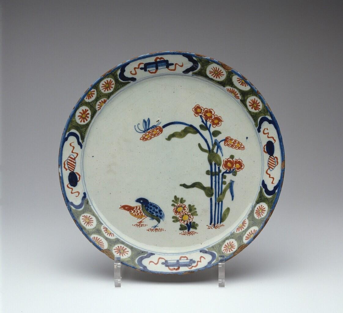De achterkant van het zonder standring uitgevoerde bord, een zogenaamde 'pannenkoek', loopt enigszins rond en heeft een vlak middendeel. De voorkant is beschilderd met een chinoiserie voorsteling van twee patrijzen voor een toefje bloemen en een b...