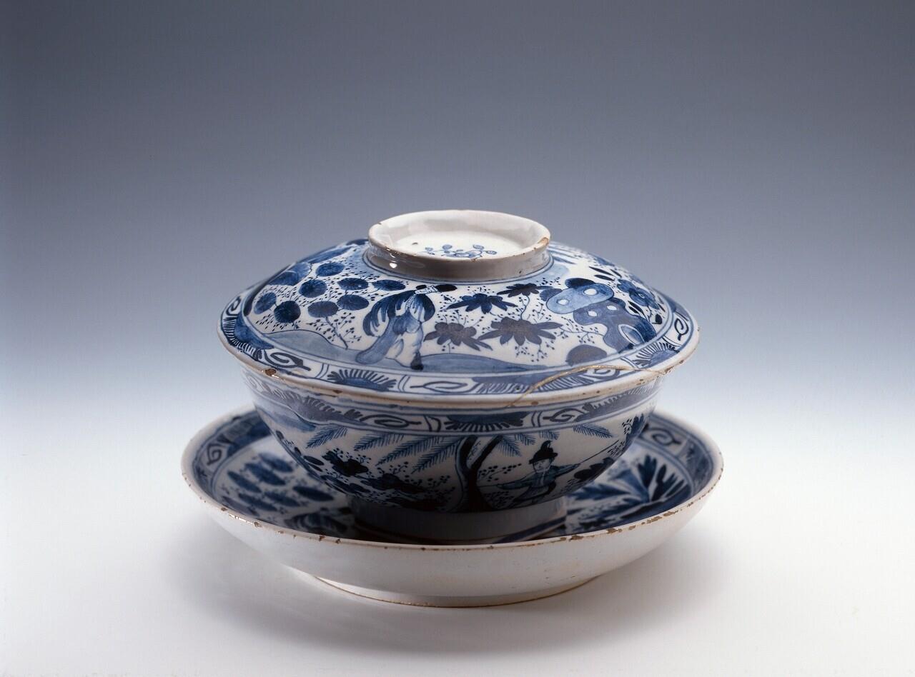 Dekselkom met onderschotel, versierd met een landschap met boom, twee figuren en florale motieven.