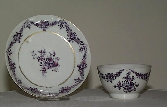 De gewelfde schotels hebben een standring en een centraal bloemendecor binnen een enkele gouden cirkel. De rand is gedecoreerd met bloemenslingers met afhangend rankwerk. De convex-conische kommen hebben een standring en op het plat een kleine blo...
