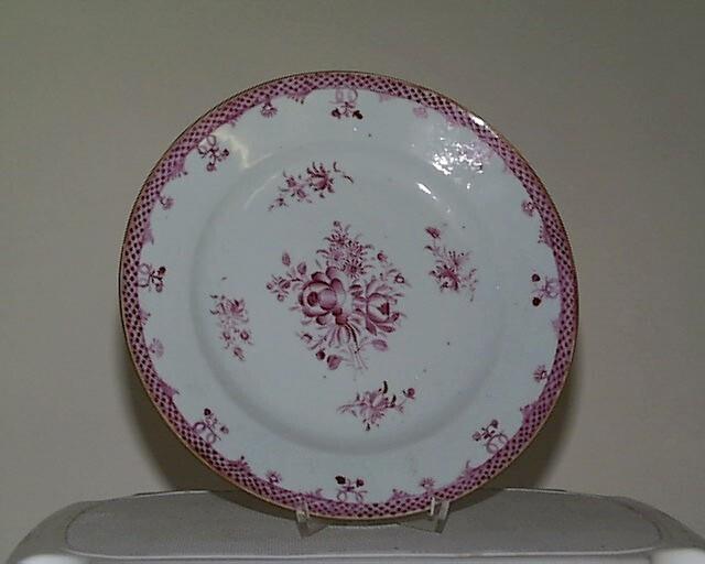 - porselein, decoratie in famille rose-techniek in Lowestoft-stijl in paars, kapucijner rand