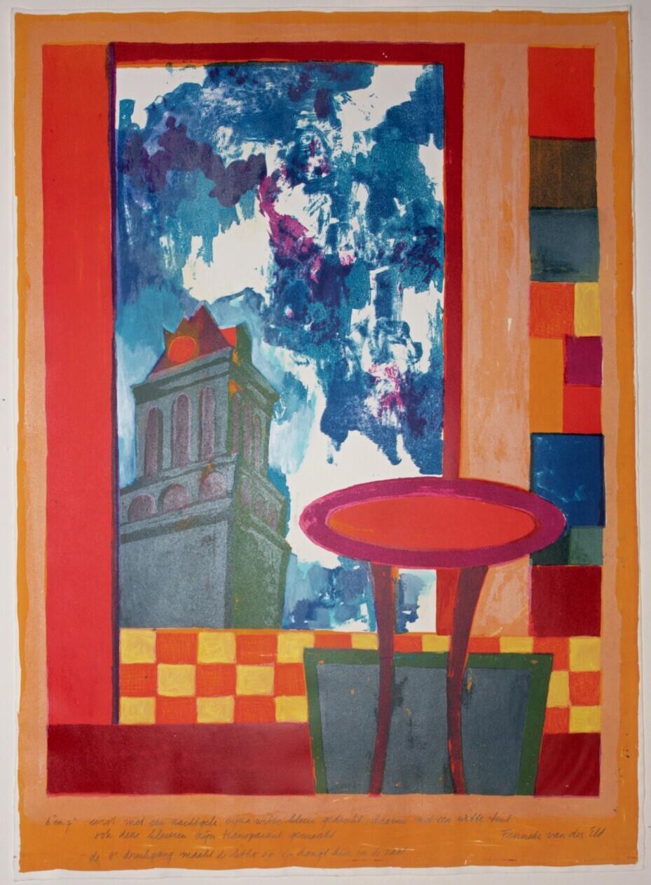Inscriptie6e en 7e eerst met een zachtgele, bijna witte kleur gedrukt, daarna met een witte tint ook deze kleuren zijn transparant gemaakt de 8de drukgang maakt de litho af en hangt in deze zaal (middenonder) - Inventarisnummer