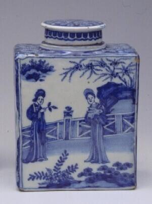 Rechthoekige theebus met een chinoiserie voorstelling van twee Chinese dames bij een hek