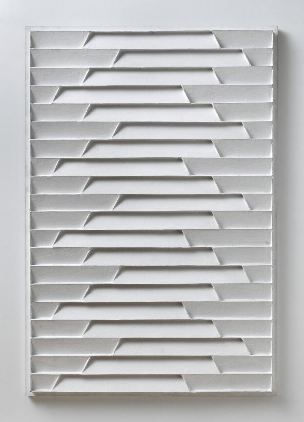 Twintig horizontale regels, enigszins in reliëf gevormd, waarbij op elke regel zich in het midden een trapeziumvormig 'compartiment' bevindt dat bij elke volgende regel iets naar rechts of links verspringt. In het midden ontstaat zo een verticale ...