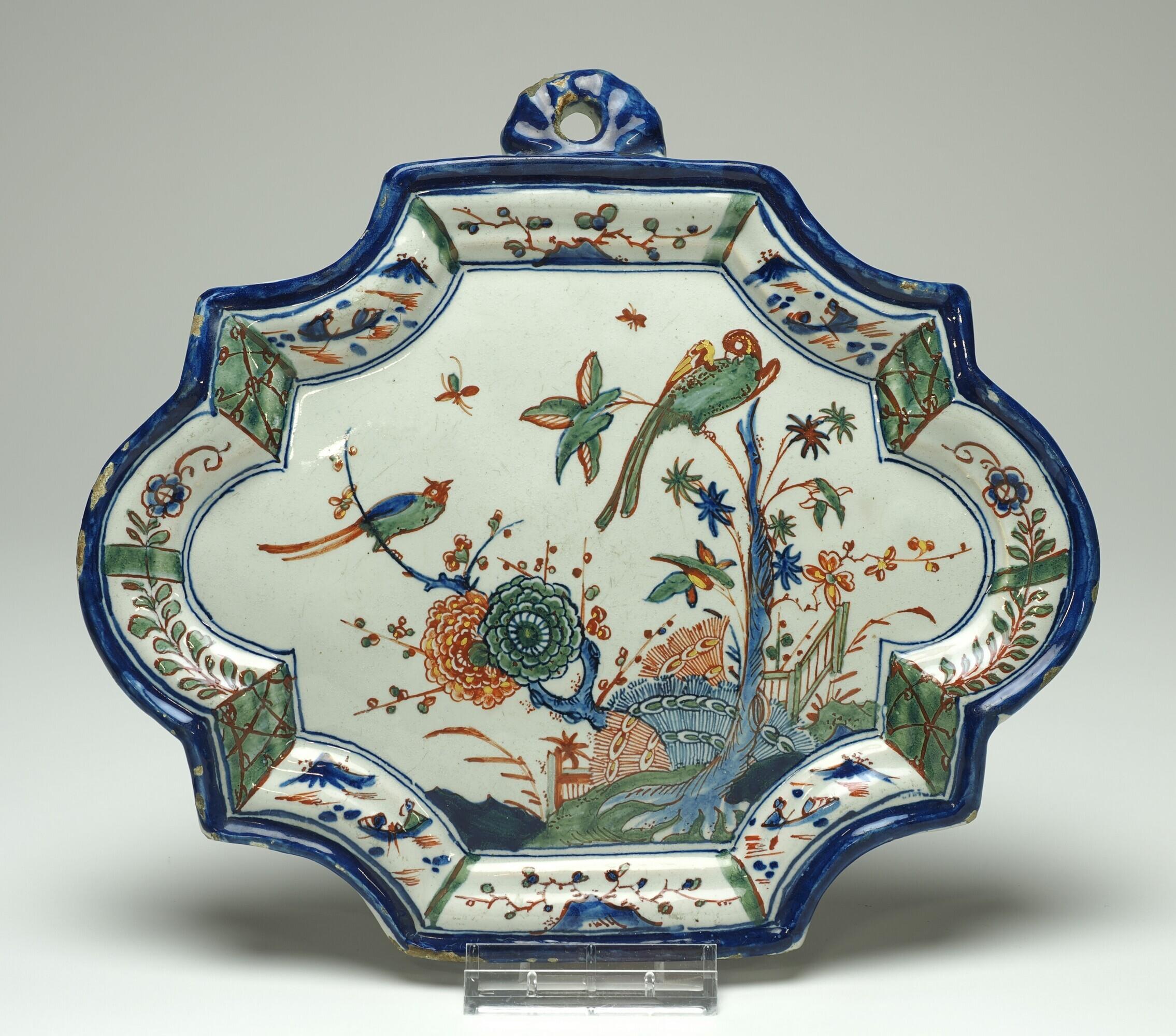Liggende ovaalvormige plaque, met symmetrisch geaccoladeerde, licht gebolde randen en aan de bovenzijde een hanglus. De plaque is gedecoreerd met een chinoiserie voorstelling van een bloeiende pioenroosstruik en een in bloei staande boom met in be...
