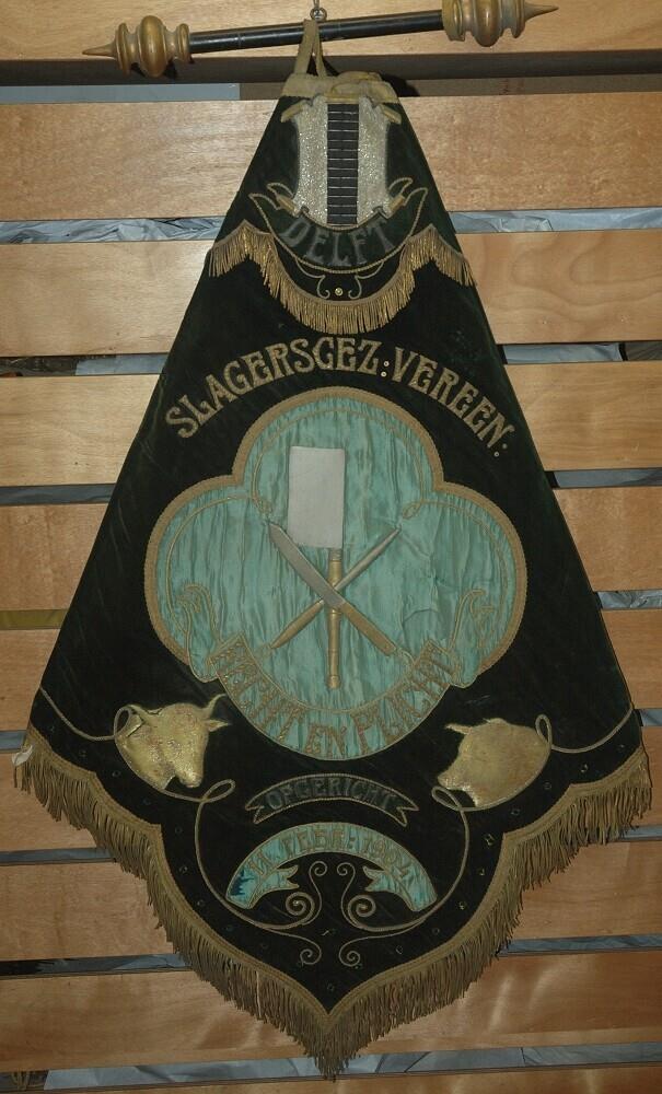 groen fluwelen driekhoekvormig vaandel in het hart gekruiste slagersmessen en het lintopschrift 'Recht en Plicht'. Daarboven het stadswapen van Delft met het onderschrift 'Delft' en 'Slagersgez: Vereen: Onderaan, tussen een koeien- en varkenskop d...
