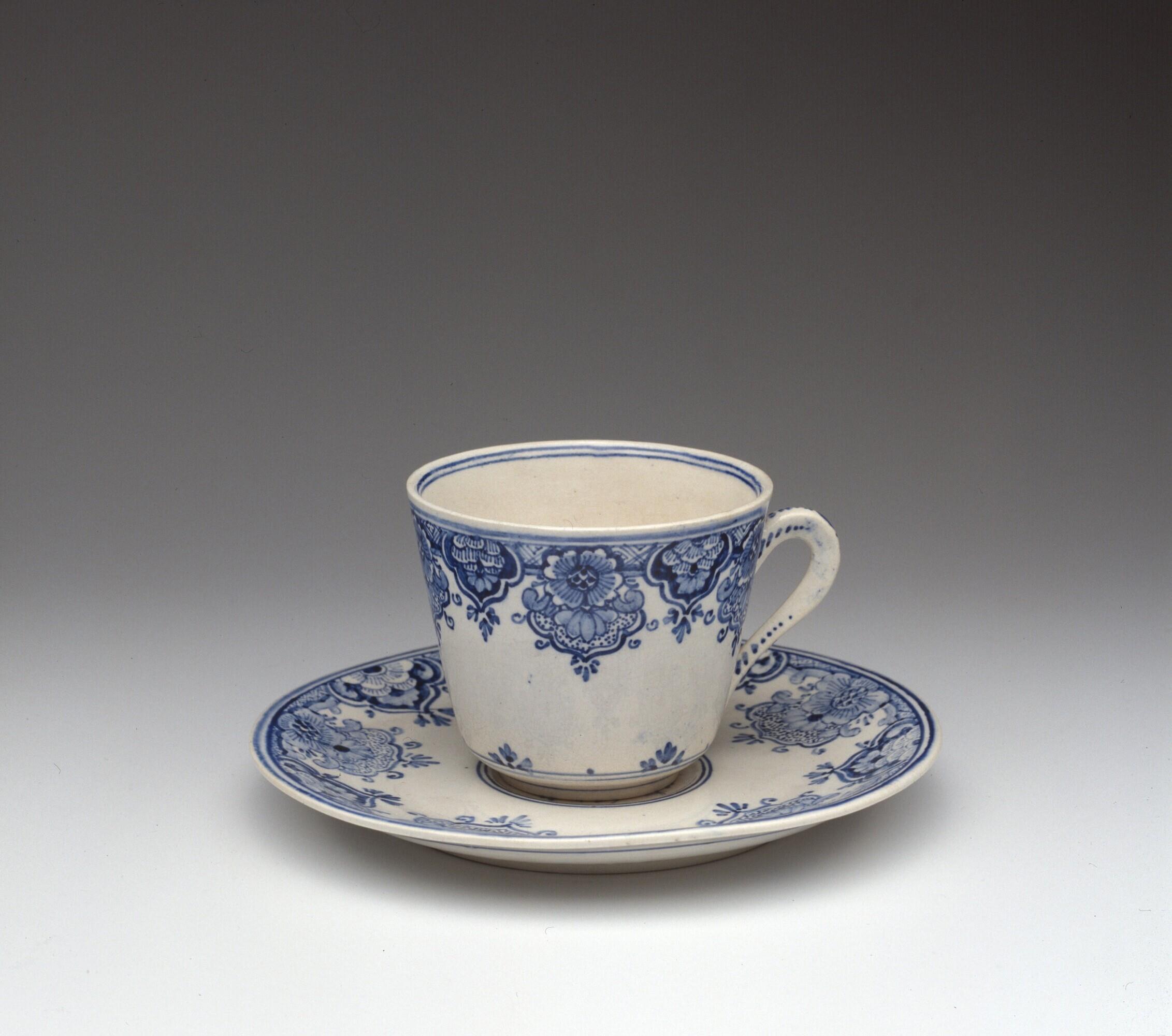 De rand van zowel het kopje als de schotel is beschilderd met een band van lambrequins. Langs de onderrand van het kopje zijn twee concentrische ringen aangebracht met een driedelig bladmotief. Op het plat van de schotel is een bloemmotief geschil...