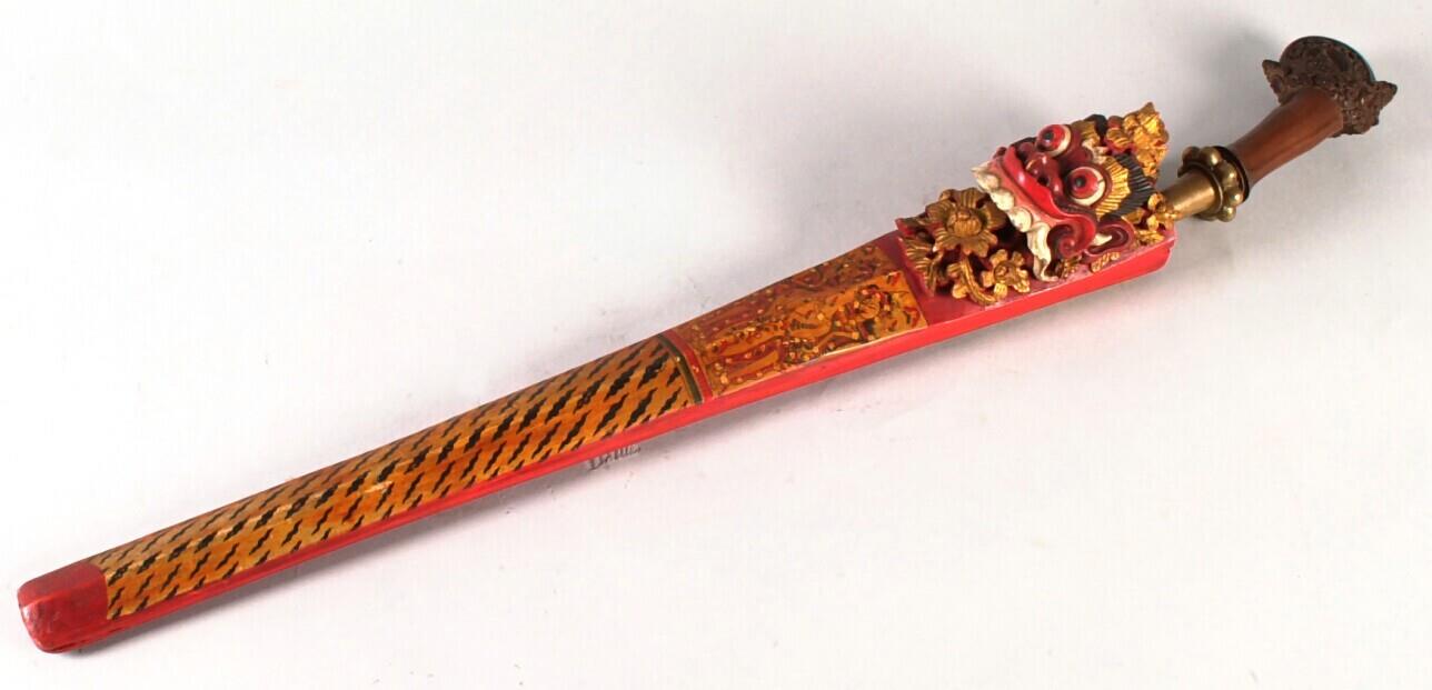 Zwaard, golok, met schede, mogelijk voor ceremoniële gelegenheden. Greep van donker hout in de vorm van een Pandji-hoofdtooi en makara-ornament. Schede versierd in reliëf met een kalakop, lotusbloemen boven de kop en aan de onderkaak. De voorzijde...