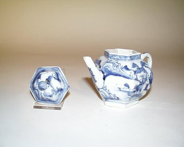 Het zeskantige trekpotje heeft een dito standring, monding en gewelfd deksel, en voorts een ovaal oor en een rechte tuit. Het trekpotje heeft een doorlopend decor van een rivierlandschap met bergen, bomen, rotsen, een huisje en een vissertje. De t...