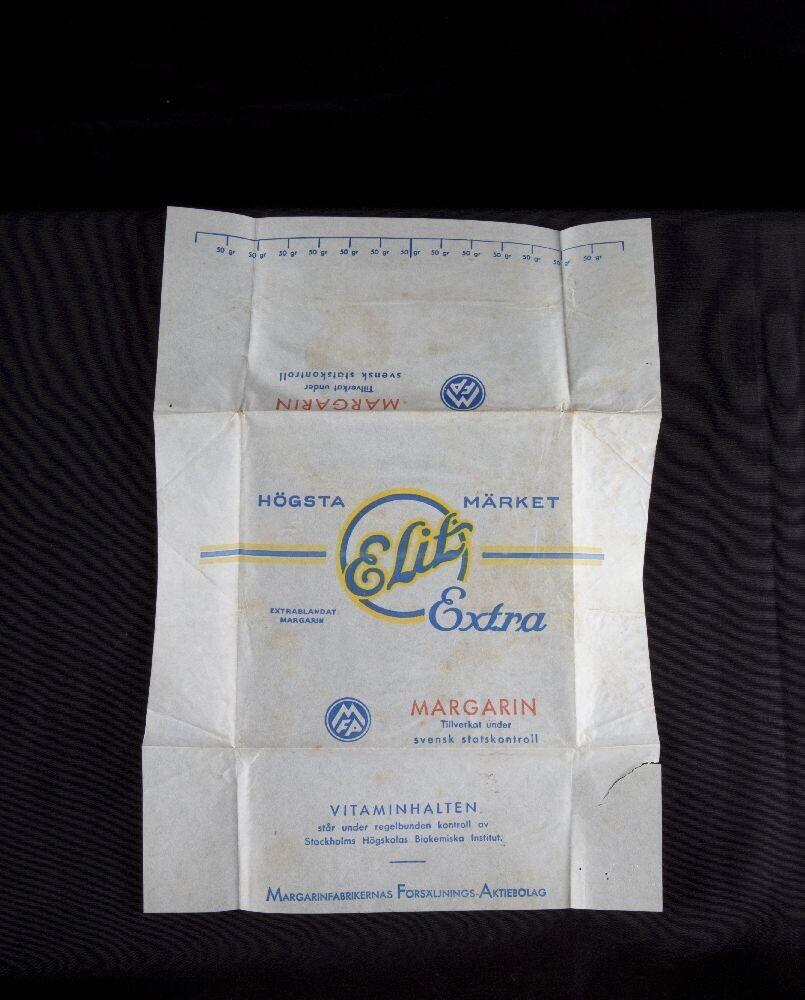 Papieren wikkel van margarine afkomstig uit Zweden. Opschrift: Högsta Märket Elit extra extrablandat margarin. Margarin tillverkat under svensk statskontroll. Vitaminhalten står under regelbunden kontroll av Stockholm Högskolas Biokemiska Institut...