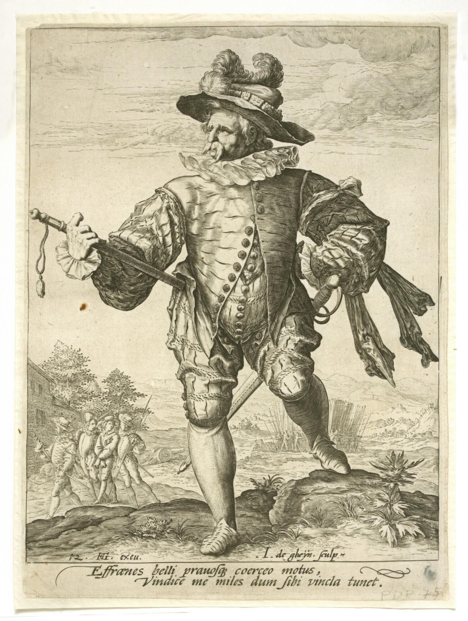 Een man met een staf in de rechterhand (een provoost), ten voeten uit, een zwaard aan zijn gordel. Op de achtergrond wordt een soldaat geboeid weggevoerd. Onder de voorstelling twee regels tekst in Latijn 'Effrænes belli prauosque corerceo motus, ...