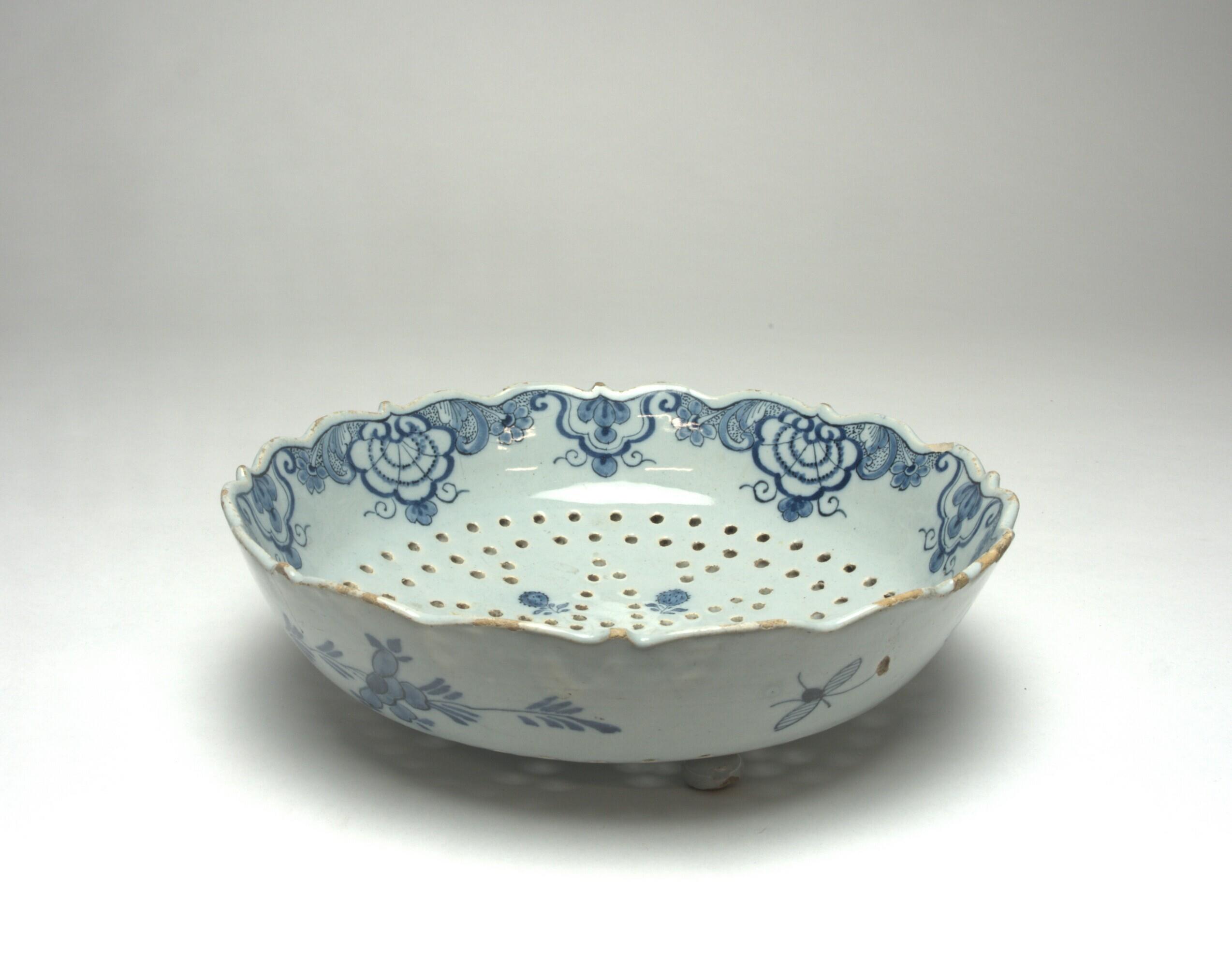 Ronde vergiet met accoladerand en rustend op drie knopvormige pootjes. De lekgaatjes vormen zespuntige ster omgeven door dubbele ring met binnenwaarts gerichte punten die tussen sterpunten steken. In het plat zes aardbeitjes, tegen de rand lambreq...