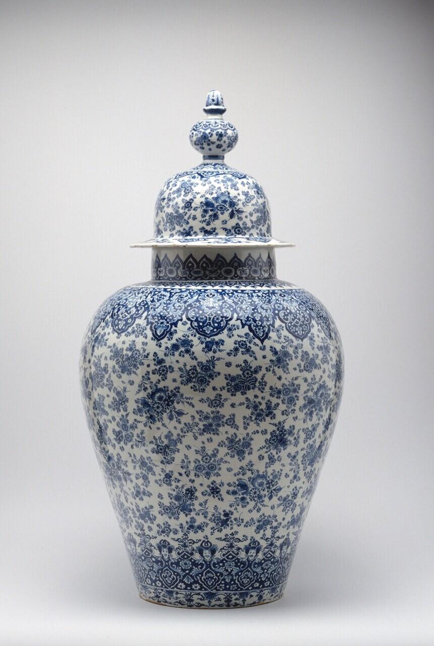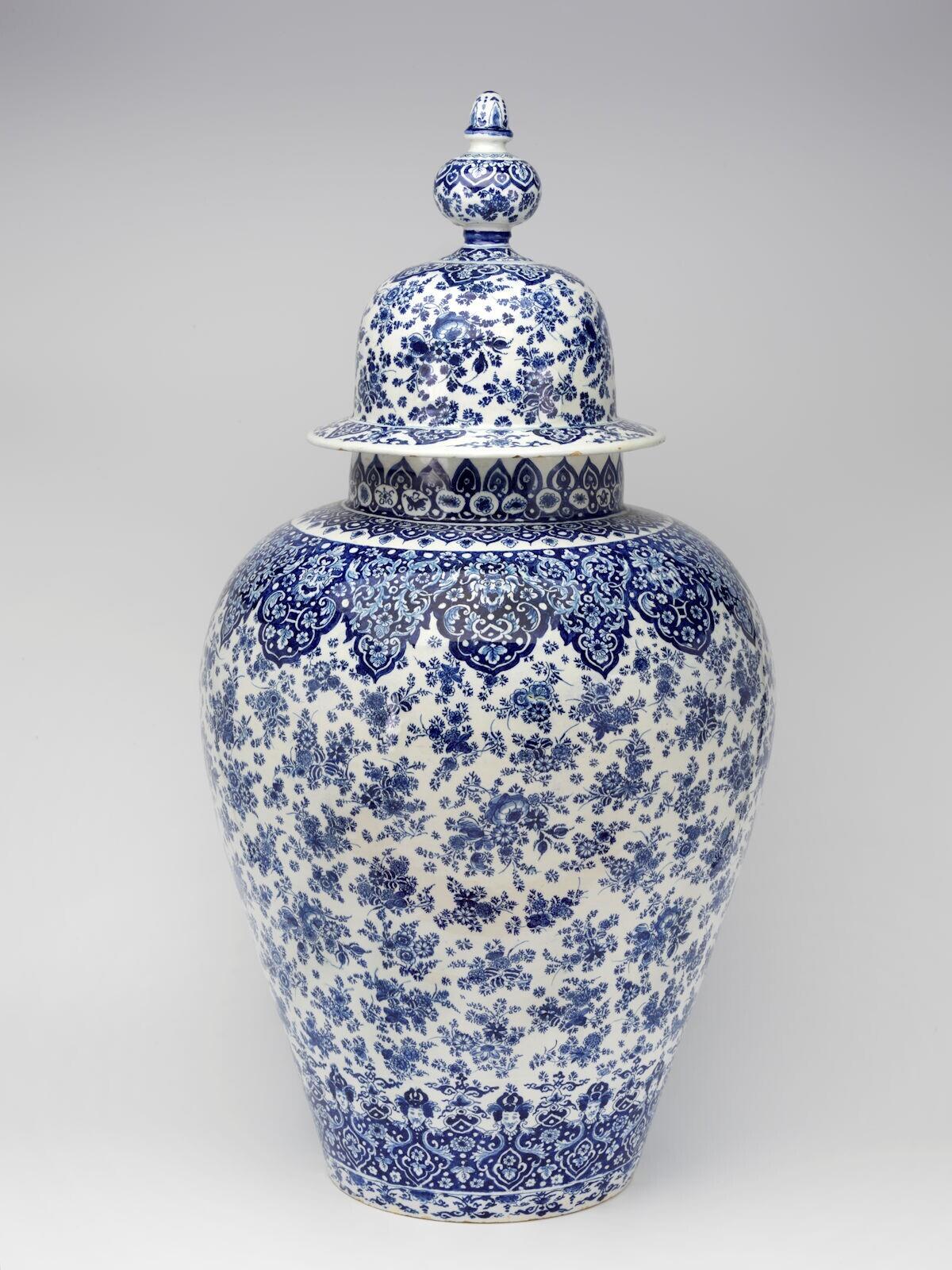 Dekselvaas gedecoreerd met bloemmotieven. Aan boven en onderkant een bladervormige krans, waarin gezichten en monsterkoppen.