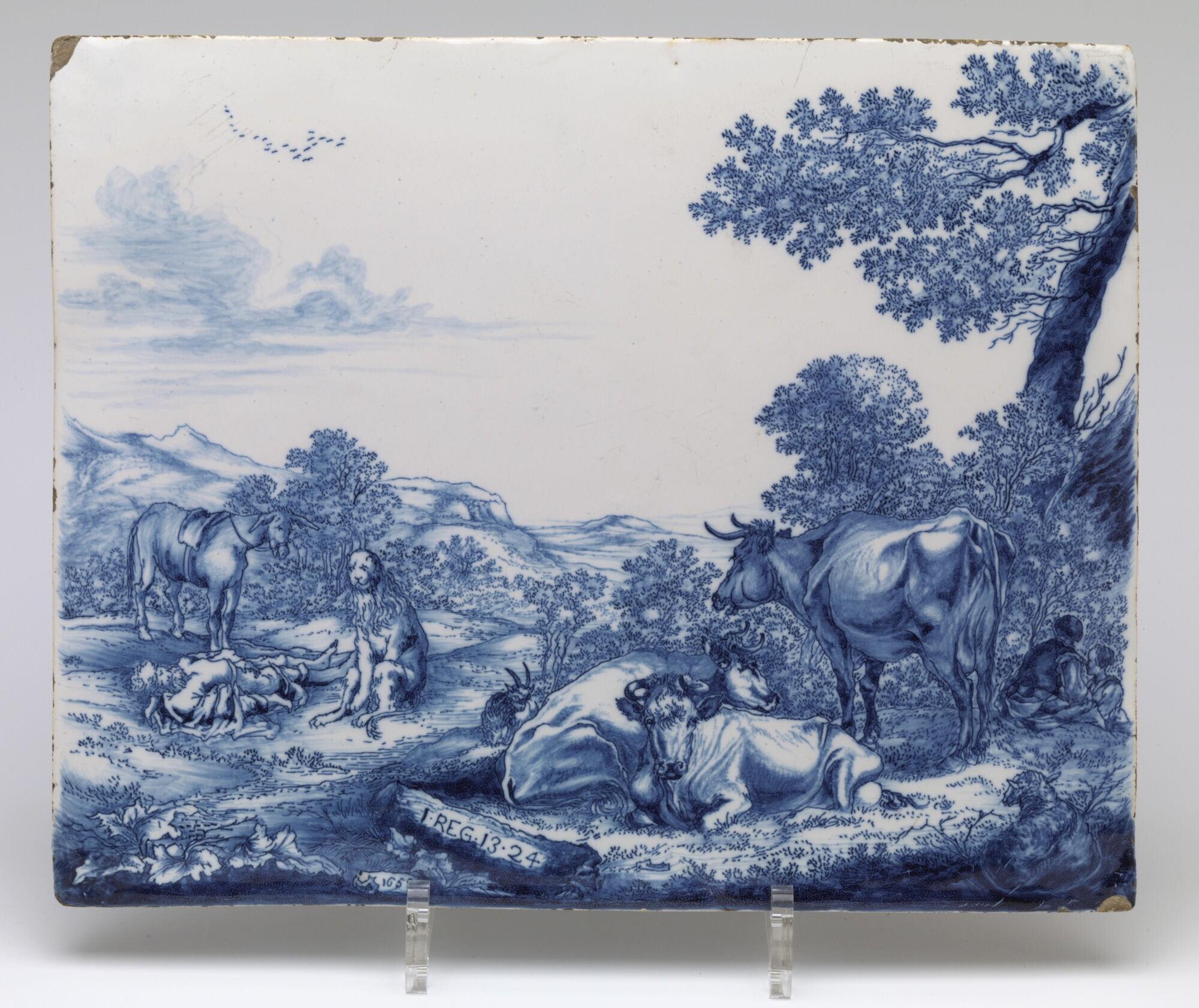 Een belangrijke inspiratiebron voor de Delftse plateelschilders zijn tekeningen en prenten van Nederlandse kunstenaars. De voorstellingen op deze plaque zijn gebaseerd op een tekening van de Delftse schilder Leonaert Bramer (1596 – 1674) en een pr...